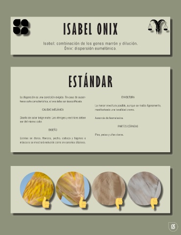 Diseño de color beige mate. Las rémiges y rectrices deben Ausencia de feomelanina.